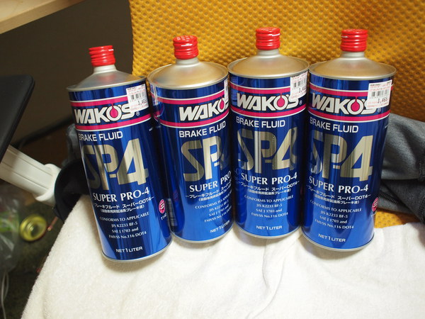 今回はWAKO'sのSP-4を使います。定価3,465円からオートバックスの誕生日月の20%引きを利用してまとめ買いしていた物です。使用量は手際よくやれば全交換でも1Lで大丈夫かもしれません。ただし初めて交換する人は1.5Lは用意しておいた方がいいと思います。