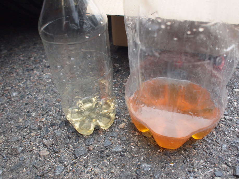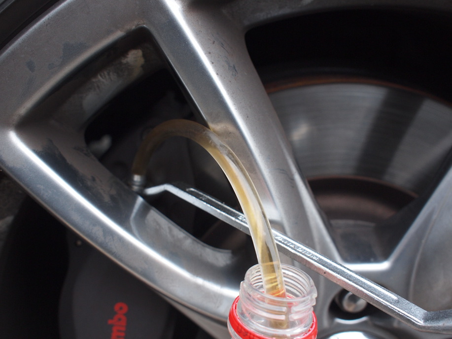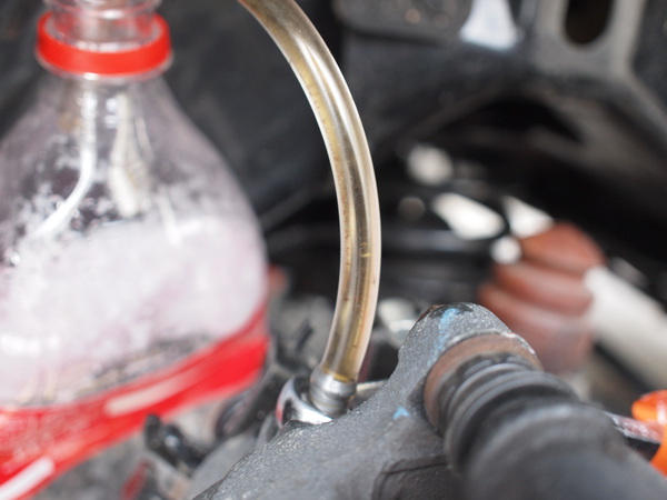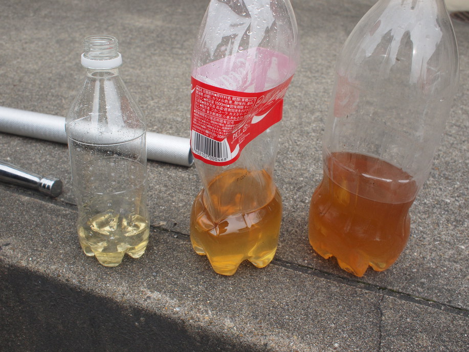 - 助手席後方側、排出されるフルードが綺麗になるまで抜きます。ペットボトルを変えながら排出してみました。出てくるフルードの色の変化をお楽しみ下さい。リザーバから一番通りキャリパーは少なくとも右 + 真ん中ペットボトルの半分位は抜かないと綺麗になりません。