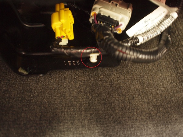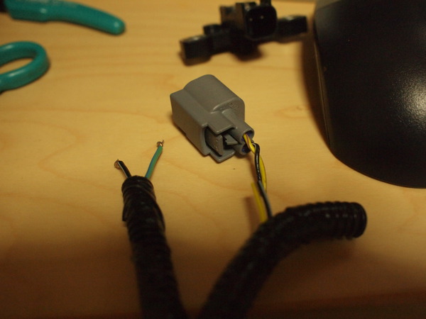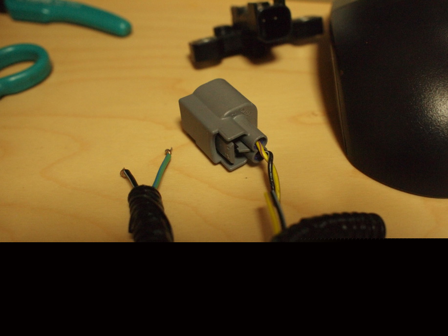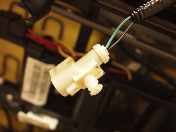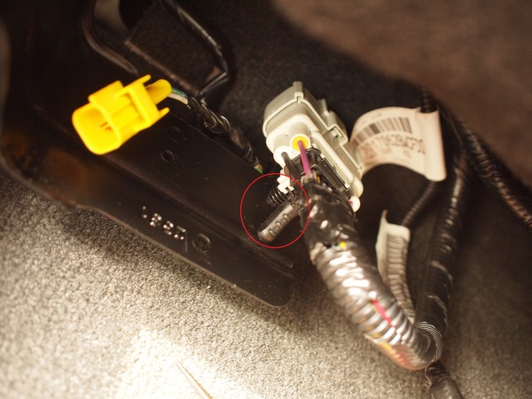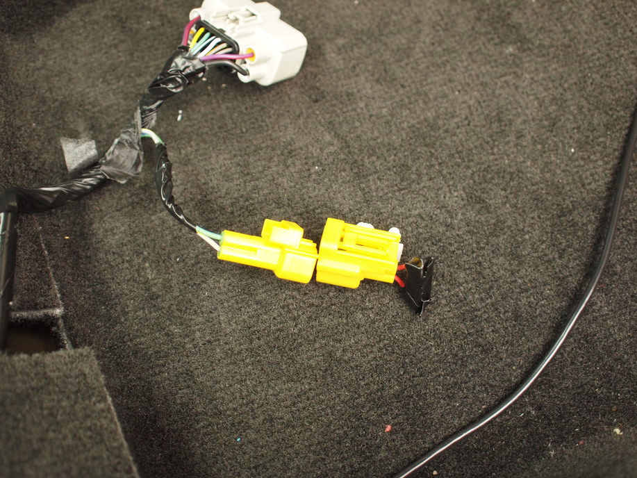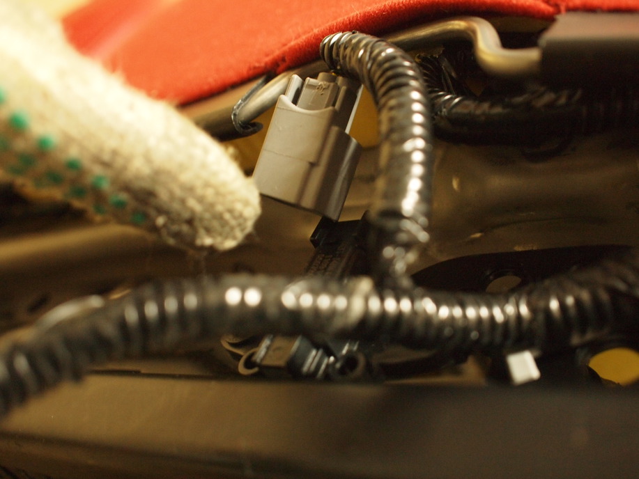 - 写真に写っているカプラーはシートポジションセンサに接続されていたカプラーです。奥に見えるのがシートポジションセンサ。"黄-紫", "黒-白" の線を切断し線を延長しましょう。