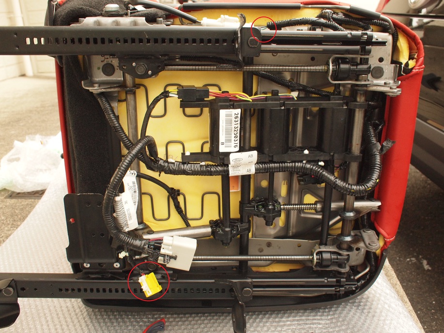- 下の写真は流用するカプラの位置を示しています。下側がエアバッグセンサ用カプラで上側がシートベルトセンサ(シートベルトのメス側の事)が先に繋がるカプラです。赤丸の位置でニッパで切断しましょう。シート下の配線を全て外すのはとても労力がいります。後述のシートポジションセンサの位置が分からずに私は全て外しましたがその必要は一切ありません。時間の無駄です。